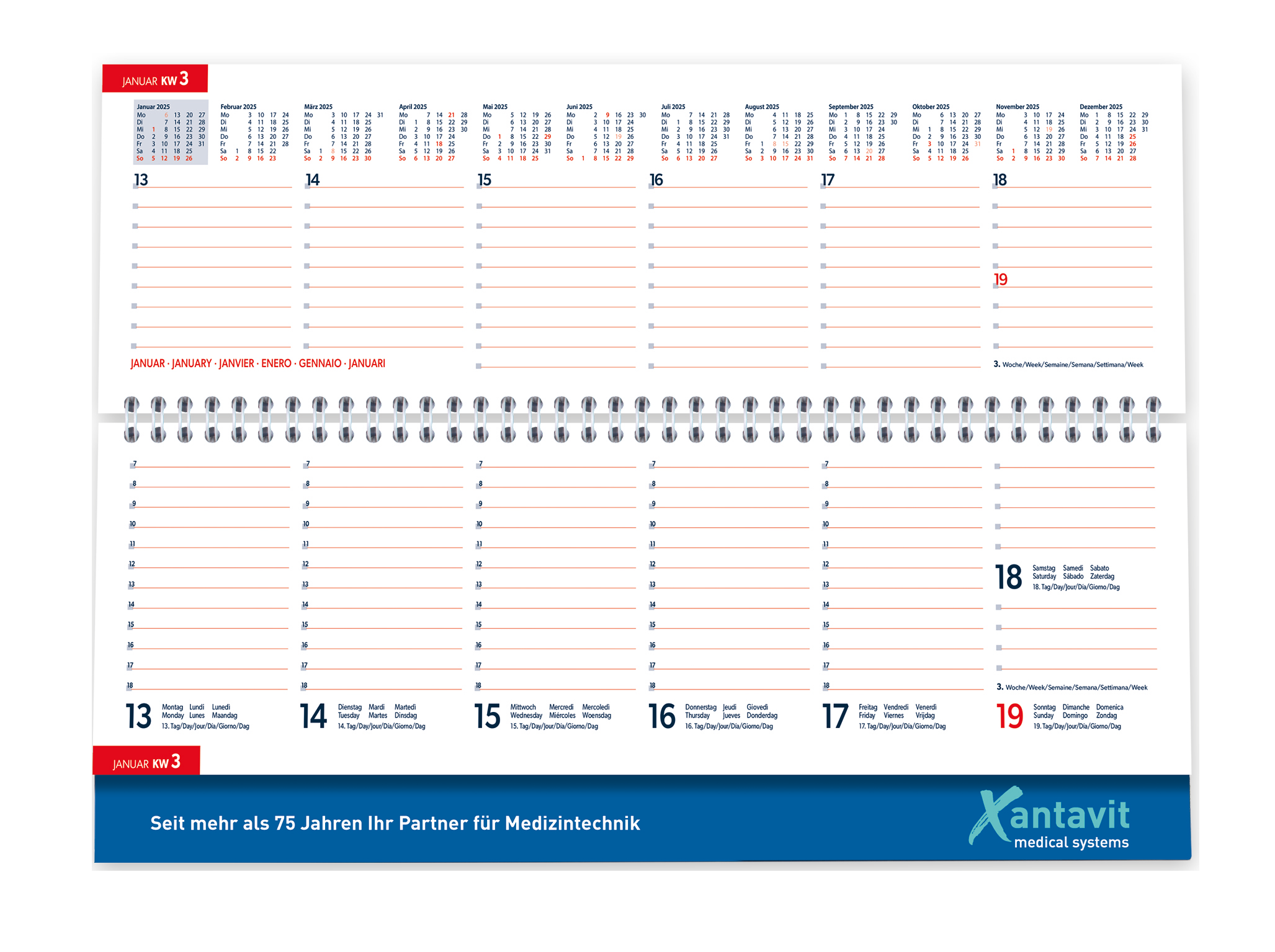 | Werbefläche: | Deck- und Abschlussblatt, Vorschaltblätter vor/nach dem Kalendarium. Auf Wunsch Deckblatt mit neutralen Motiven bestellbar. Deckblatt: 34,0 x 11,0 cm; Abschlussblatt: 34,0 x 14,0 cm |