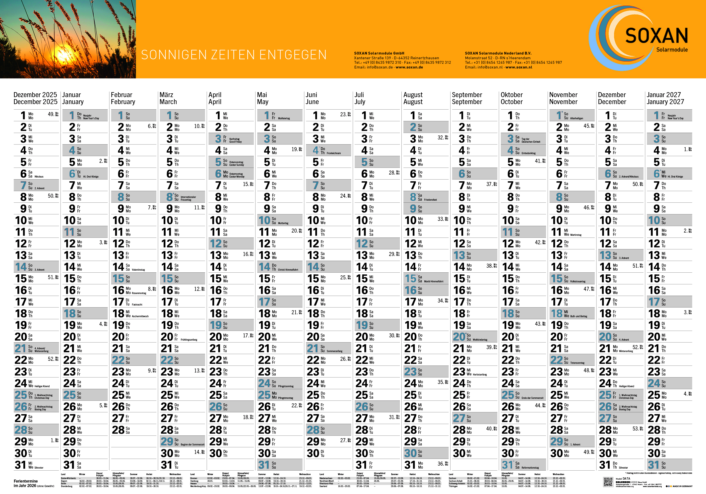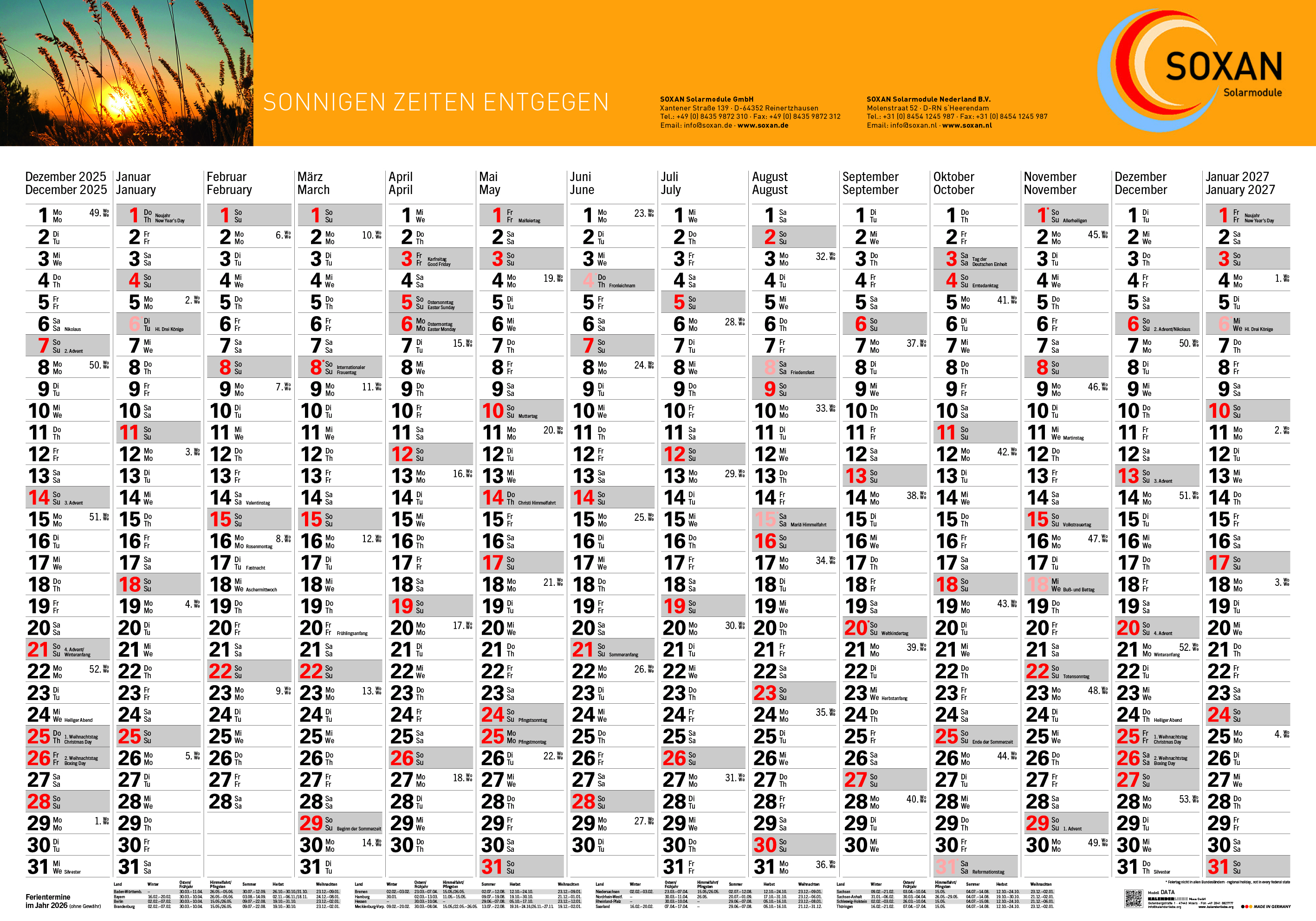 Das Kalendarium ist zweisprachig in Deutsch und Englisch gestaltet und eignet sich daher ideal für international tätige Unternehmen oder Büros mit mehrsprachigen Teams. Sonntage und deutsche Feiertage sind farblich hervorgehoben, was die Orientierung erleichtert.