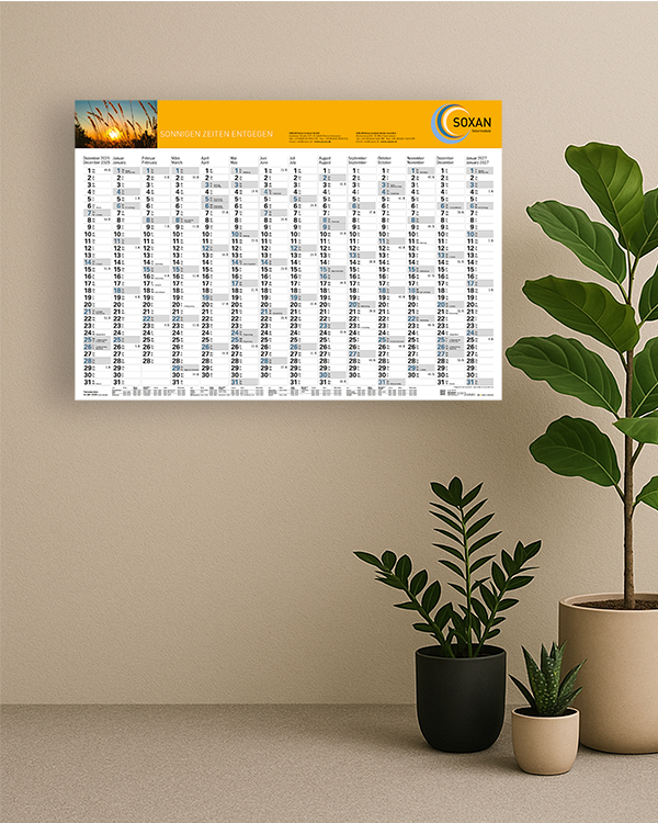 Wahlweise kommen die Planer gefaltet oder aufgerollt zu Ihnen. Ohne langes Suchen oder Überfliegen. Die Kombination aus übersichtlicher Gestaltung und intelligenter Tagesanzeige macht unsere Kalender zu einem unverzichtbaren Planungsinstrument für alle, die Wert auf Klarheit, Effizienz und Präzision legen.